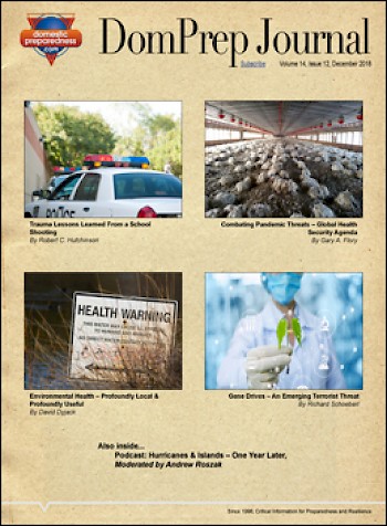 Featured in this issue: Building a Healthy & Resilient Community, By Catherine L. Feinman; Trauma Lessons Learned From a School Shooting, By Robert C. Hutchinson; Combating Pandemic Threats – Global Health Security Agenda, By Gary A. Flory; Podcast: Hurricanes & Islands – One Year Later, Moderated by Andrew Roszak; Environmental Health – Profoundly Local & Profoundly Useful, By David Dyjack; Gene Drives – An Emerging Terrorist Threat, By Richard Schoeberl